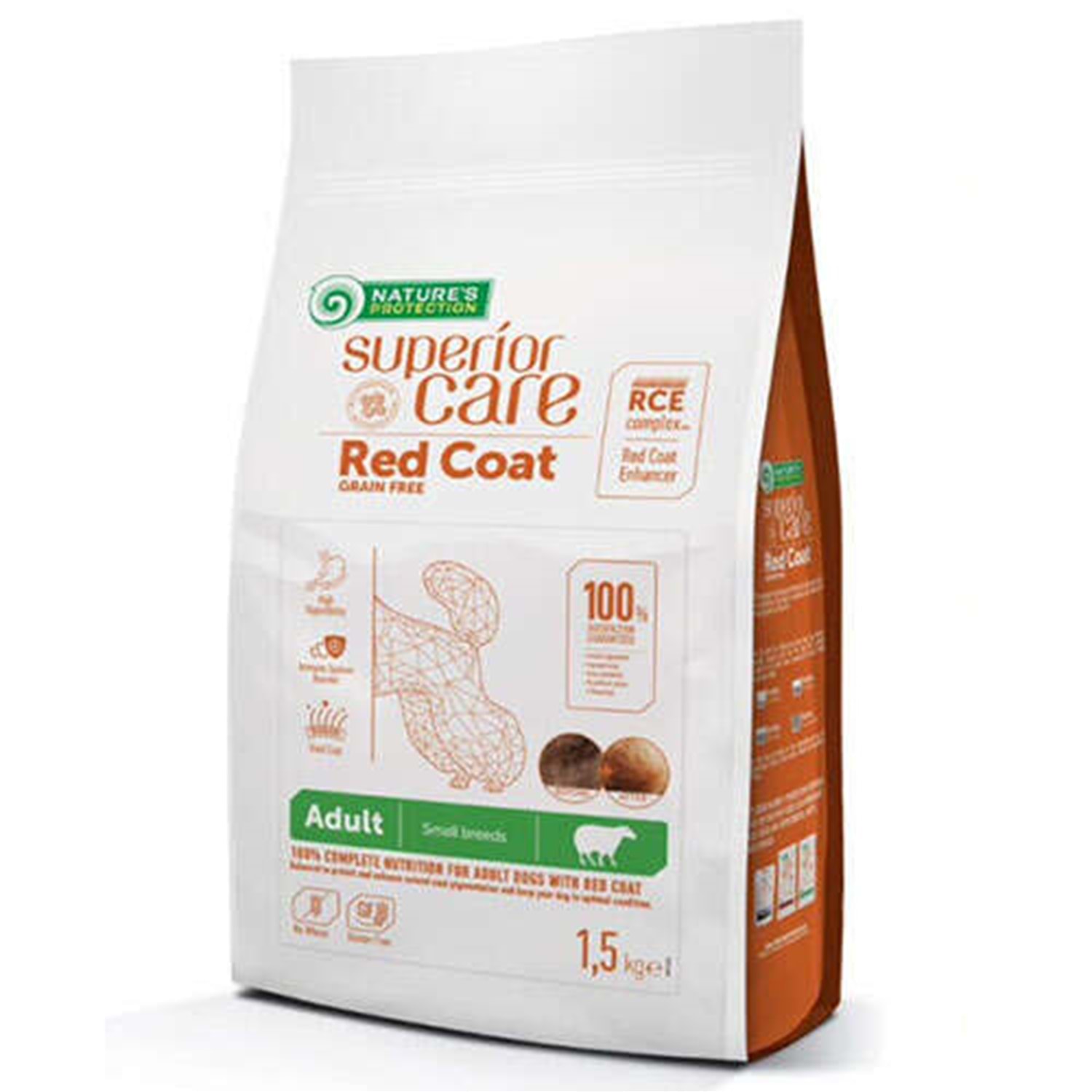Nature's Protection Superior Care Red Coat Tahılsız Kuzu, yetişkin, küçük cins köpekler için kuzu eti içeren tam teşekküllü, yüksek kaliteli, tahılsız bir yemdir.